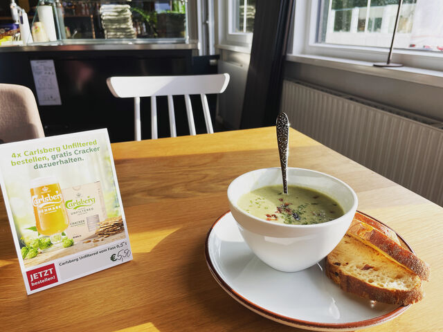 Wir verstehen uns nicht als klassisches Speiselokal, und die Liste der leckeren Snacks, Kuchen und Torten wird ständig erweitert. Neben dem Klassiker Currywurst mit hausgemachter Sauce sowie Flammkuchen stehen auf unserer Schiefertafel im Lokal saisonal und tagesaktuell weitere Angebote und Leckereien, z.B. selbstgemachte Suppen, Ofenkartoffeln mit Quark (und wahlweise z.B. Räucherlachs oder Matjes) etc.
